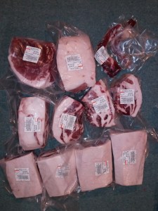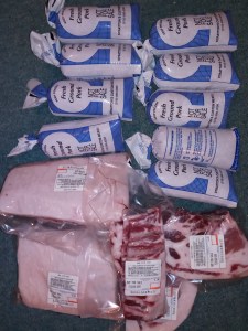 We get questions about this all the time, so it seemed like it was time to do a full scale breakdown. The last pork share that we kept for our family had a hanging weight of 170lbs. On this post you will find pictures of the finished pork. I have listed out the approximate weight of each type of cut we received below.