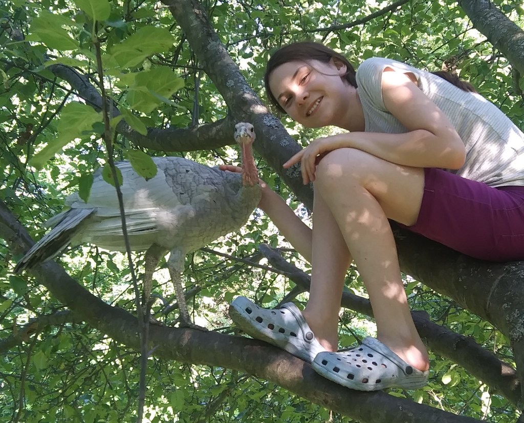 Our daughter is the animal whisperer. There isn’t an animal on the farm that hasn’t benefitted from her loving care. She is in charge of the laying and breeding birds, including chickens, ducks, geese, and turkeys. When she isn’t caring for birds, or leading a group of kids on a farm tour, you might find her in a tree reading a book.